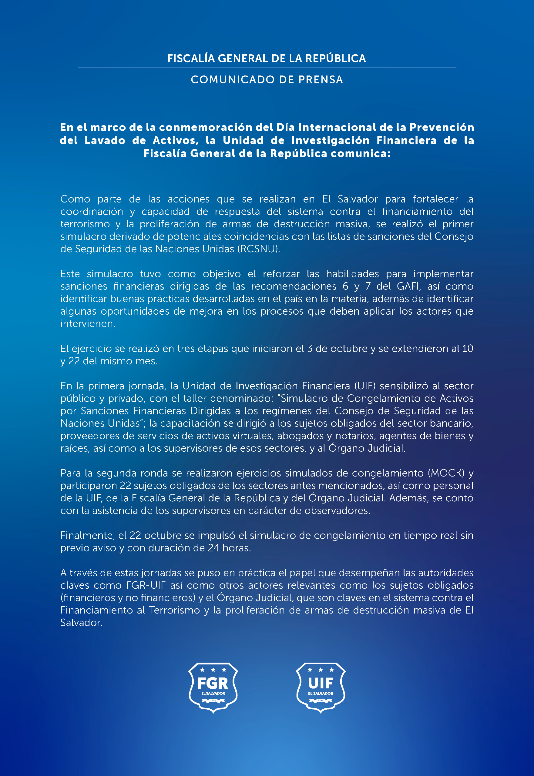 En el marco de la conmemoración del Día Internacional de la Prevención del Lavado de Activos, la Unidad de Investigación Financiera de la Fiscalía General de la República comunica: